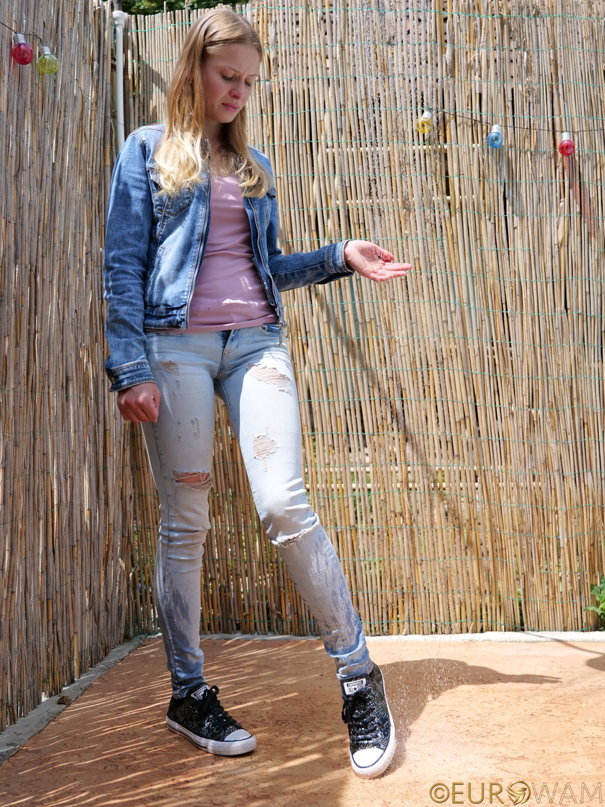 Water streamed down her jeans and jacket, soaking everything with a splashy vengeance. She stood there, stone-faced, like a fashion-forward statue honoring “Women Who Regret Wearing Denim in July.”