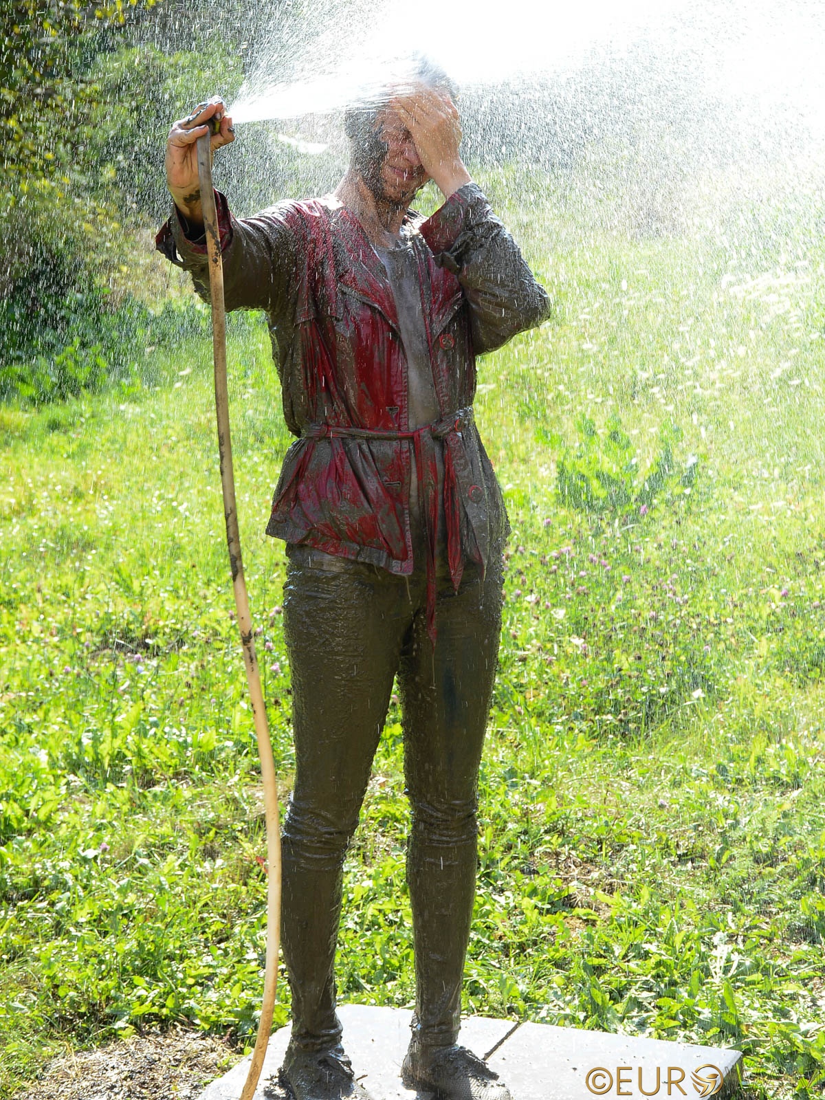 mud, sneakers, jeans, blouse, jacket, wash-off