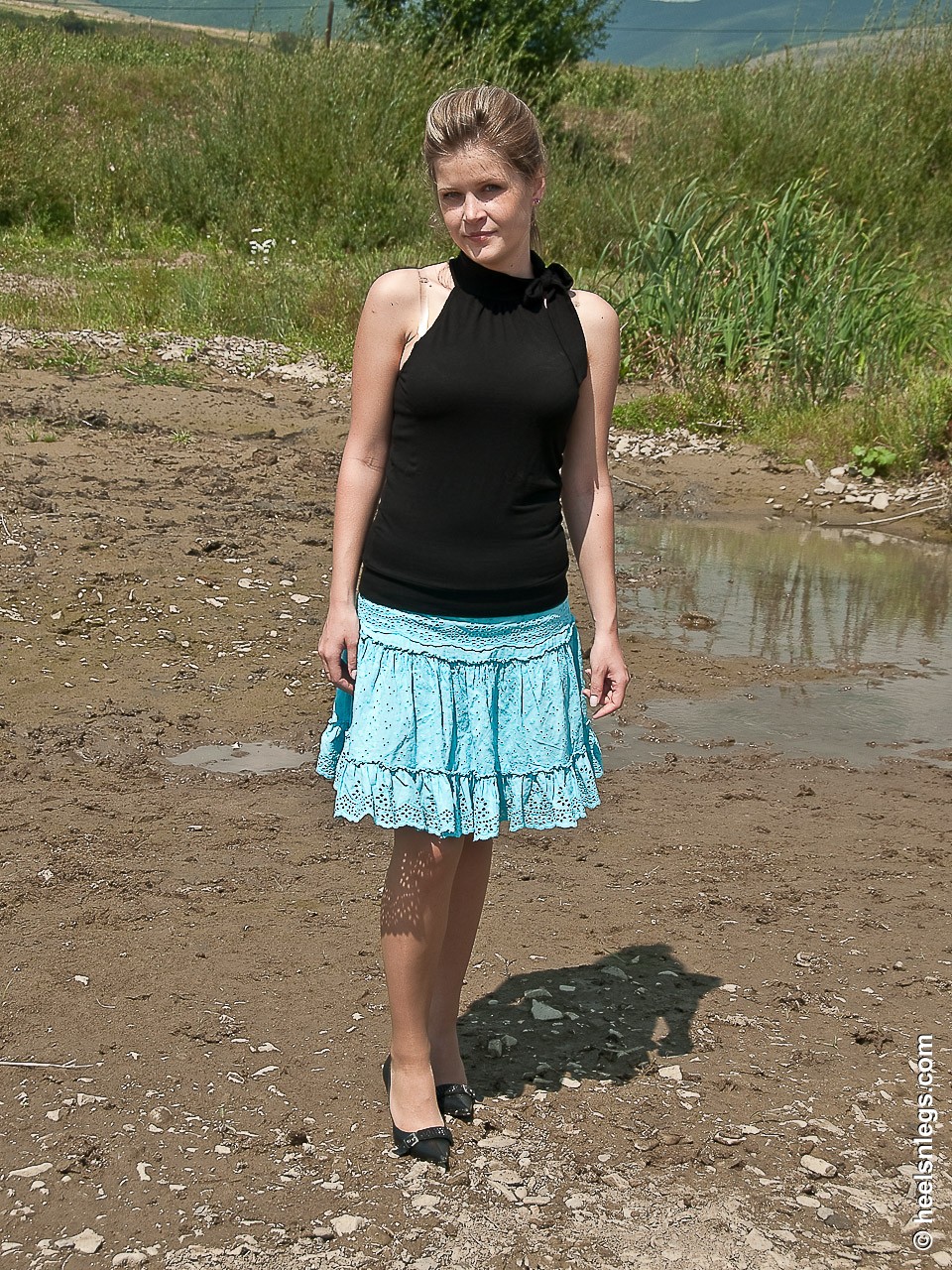 Theodora is back in the mudpit, with another pair of sexy heels, but this time she wears tan Lycra pantyhose. Check out the update to see those heels and pantyhose well dirtied in the mud.