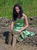 mud, messy, dress, silk, heels, pantyhose, wash-off