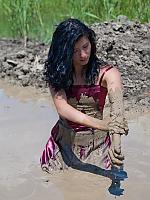 mud, messy, dress, heels, pantyhose, wash-off
