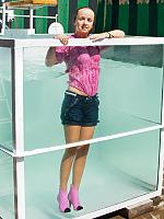 outdoors, boots, dunk tank, shirt, denim shorts, pantyhose, wet, wetlook