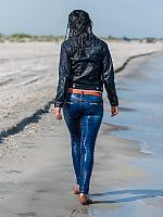sea, heels, nylon socks, barefeet, jeans, t-shirt, denim jacket, wet, wetlook