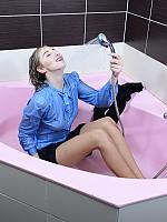 Do we get to see her walk wet from the tub back to the table? Are there any nice close ups of her shoes squishing during this? I love when you shoot that. I am very much liking this new style of showing the model walking wet and then sitting down afterwards while still wet. Nice work!