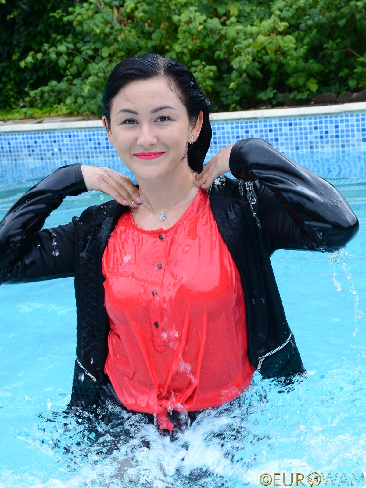 pool, heels, pantyhose, skirt, shirt, jacket, wet, wetlook