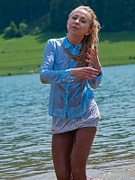 This update was originally made for a custom-videos.com client, BUT the version you see now is much shorter of course. JuliaB plays in the lake after a walk in the city. She is wearing a white summer skirt and a thin shirt without bra under, red leather boots and stockings.