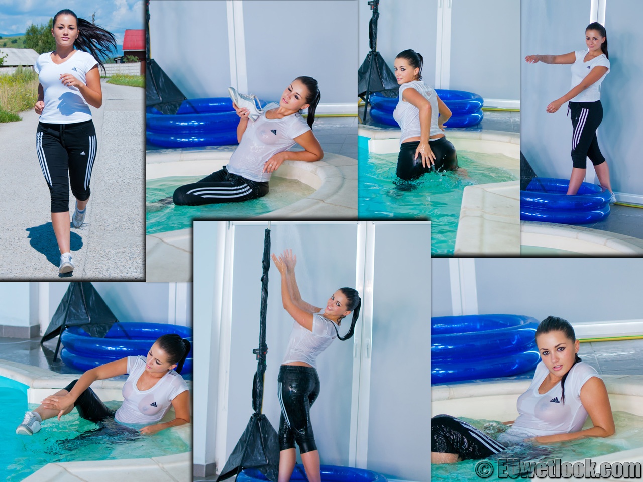 She takes a walk in the city after jogging and then she plays in the pool still dressed with her sexy sports outfit. No bra this time and we also installed a shower next to the pool.