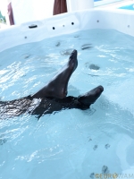 jacuzzi, heels, pantyhose, leather skirt, t-shirt, shirt, seethru, braless