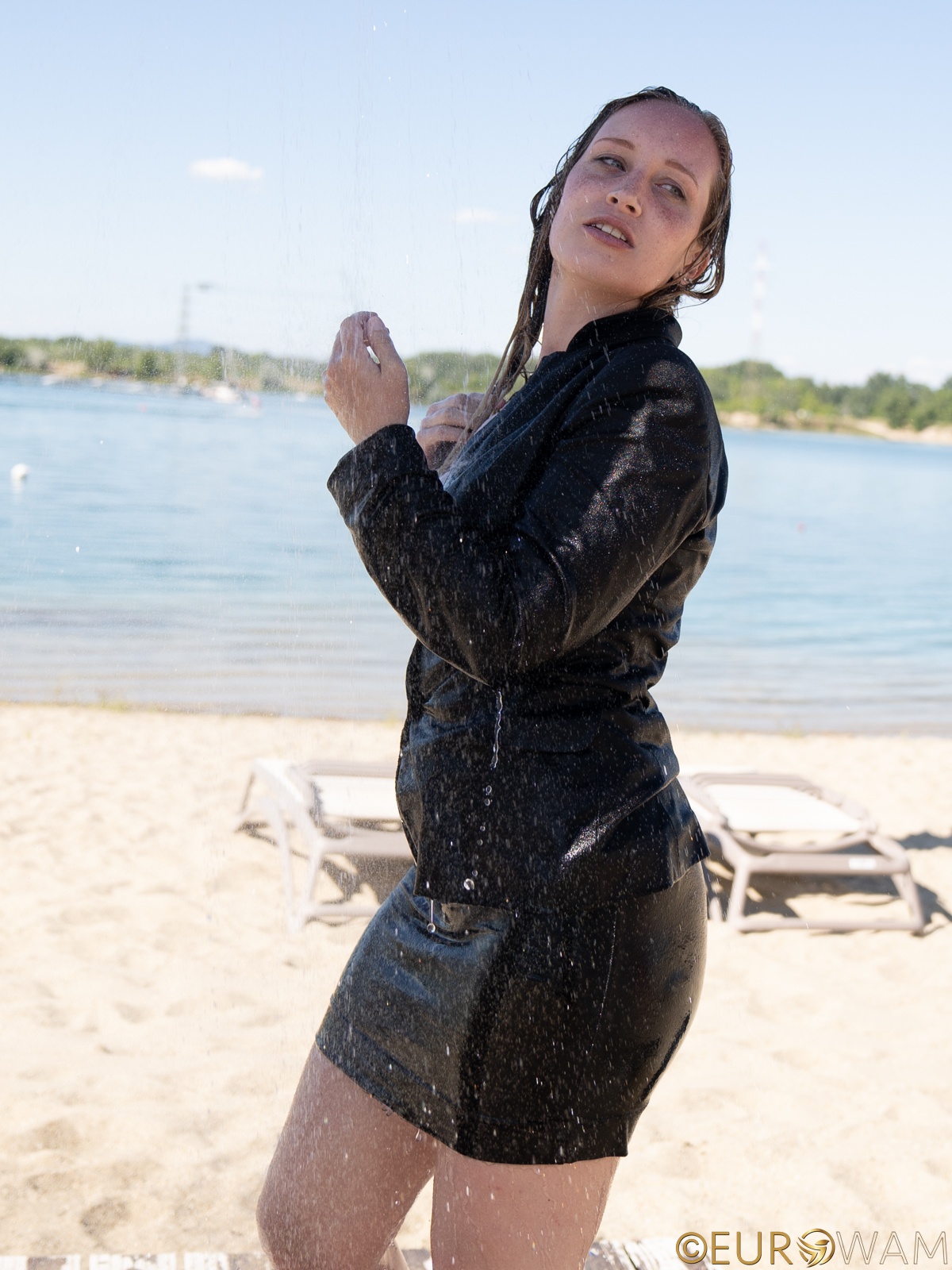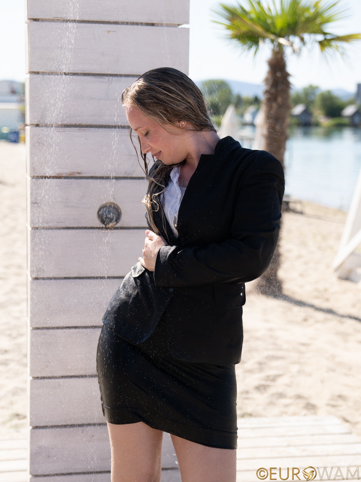 shower, lake, heels, office clothes, shirt, dress, jacket