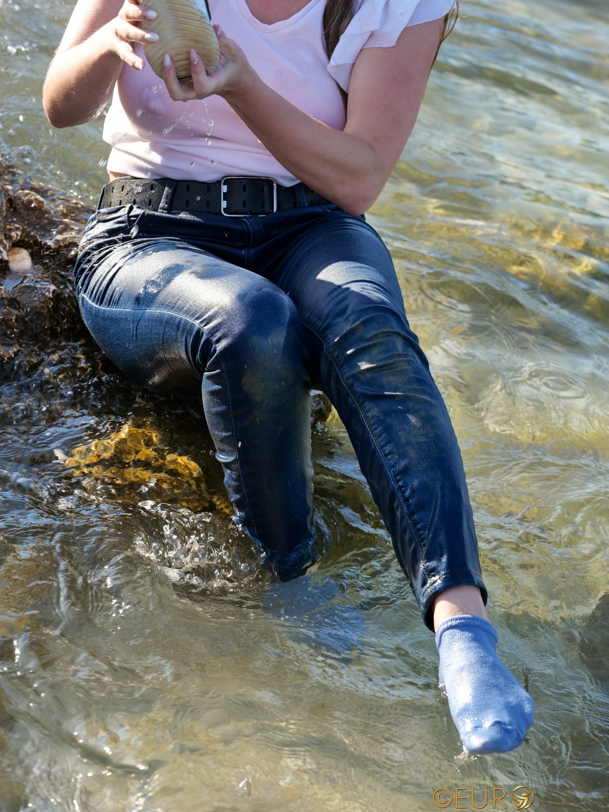 A very beautiful Update. Does she take off her shoes and show her nice wet blue socks? Can you post a picture of her wet socks please? Thanks in advance :-)