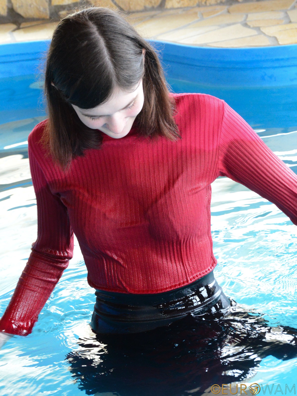 pool, shoes, ballet flats, pantyhose, skirt, blouse