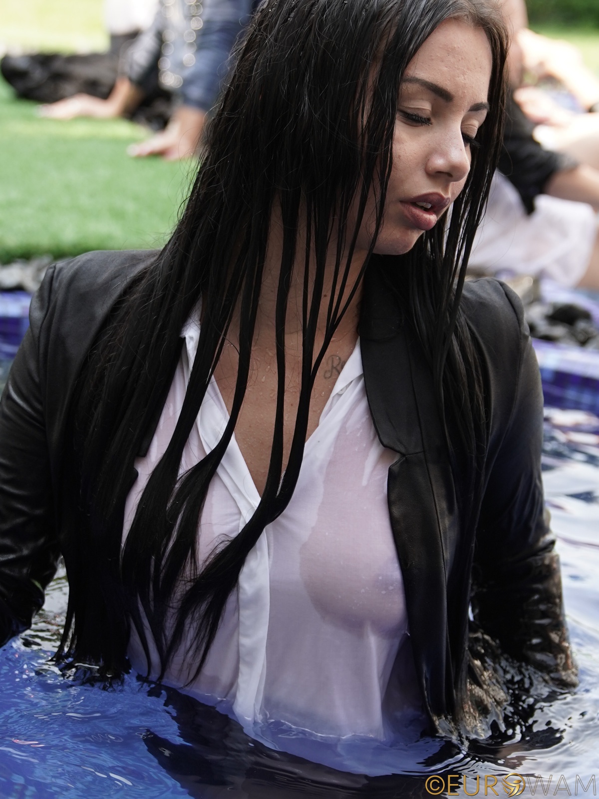 pool, heels, pantyhose, skirt, jacket, seethru, office clothes, shirt