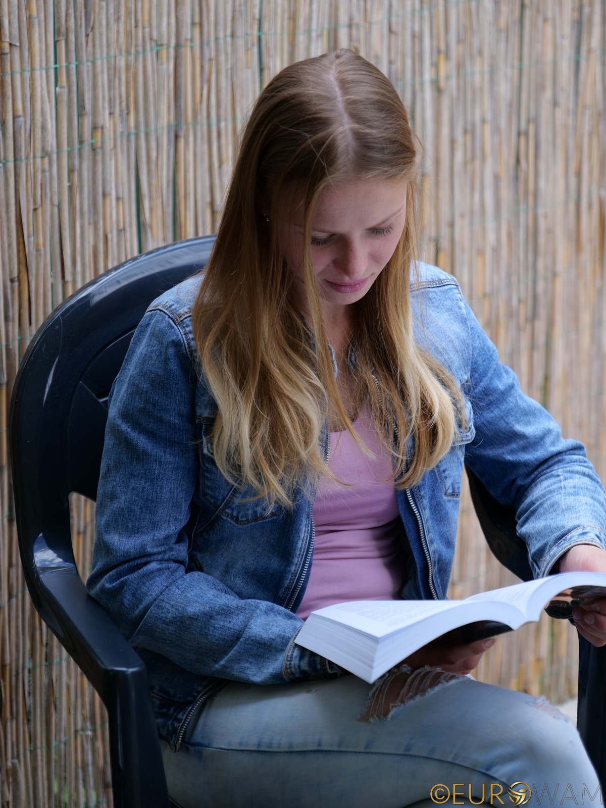 Without a word, she sighed, marked her page with her finger, stood up, and calmly placed the book on the nearby plastic table like a librarian about to do something slightly illegal.
