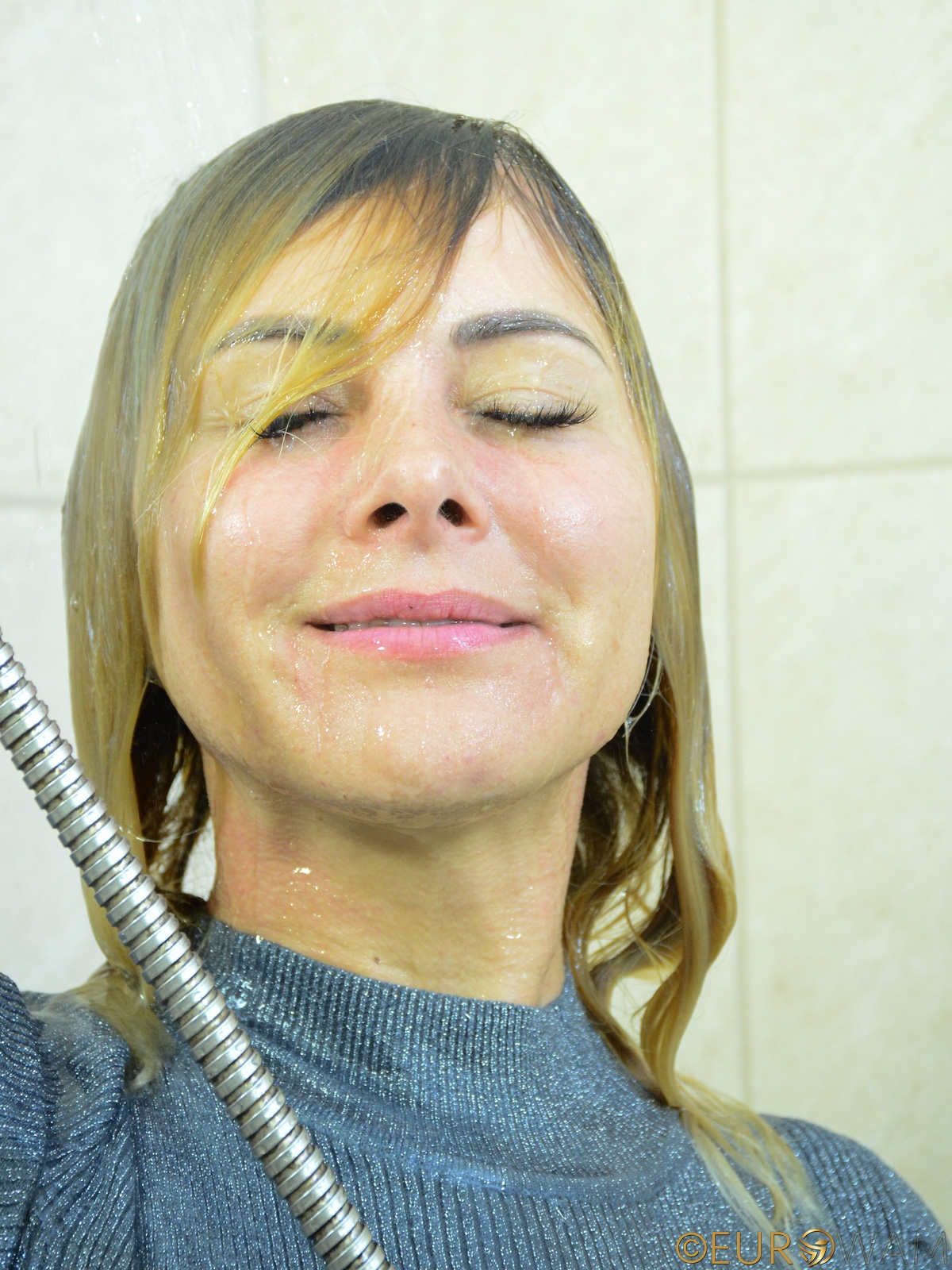 In the bathroom, she activated the sacred showerhead and confirmed: the water flowed. Mission confirmed. But instead of just turning it off, she sat right down—fully dressed—and embraced the moment.