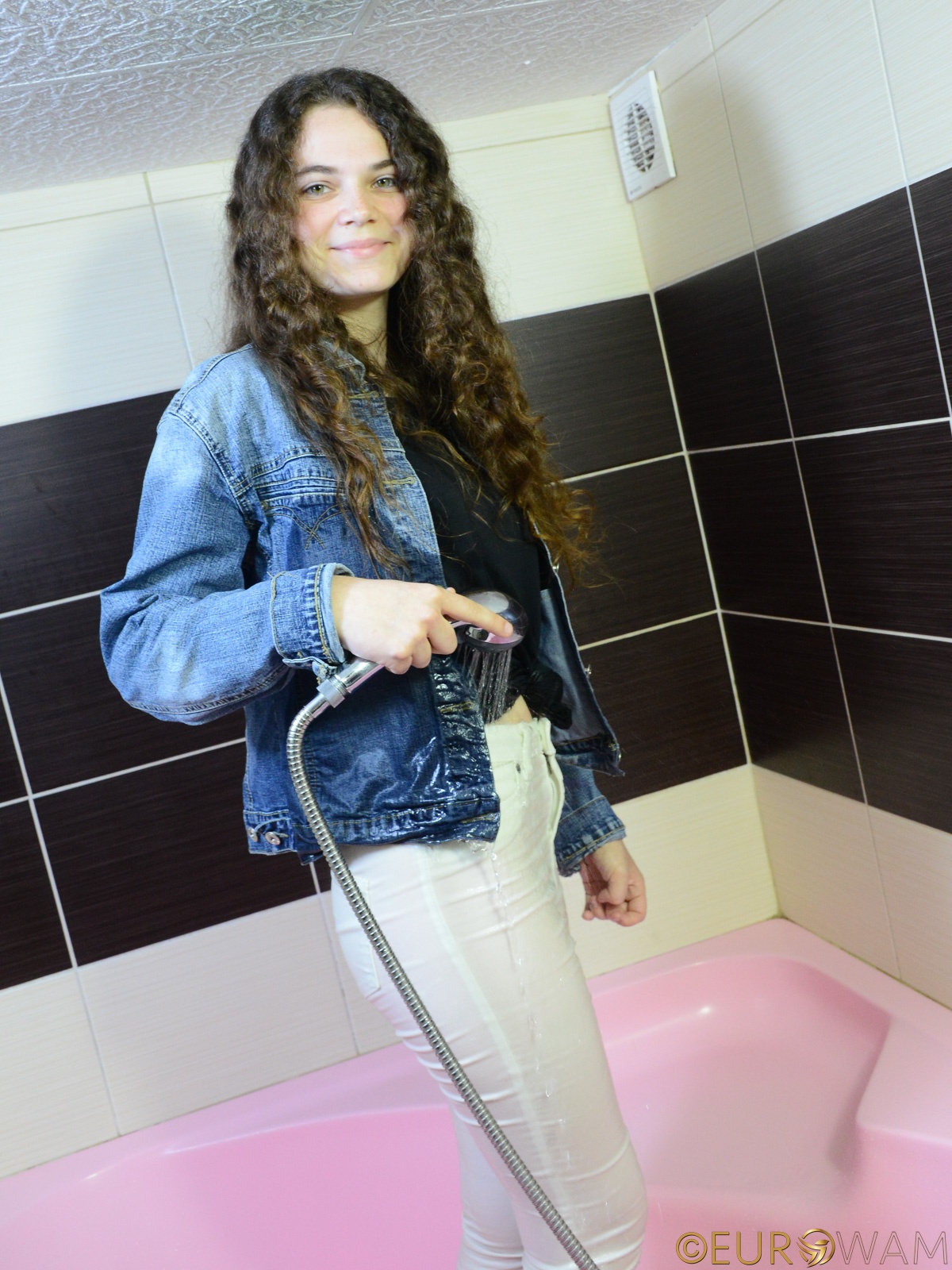 bathtub, sneakers, pants, t-shirt, denim, jacket