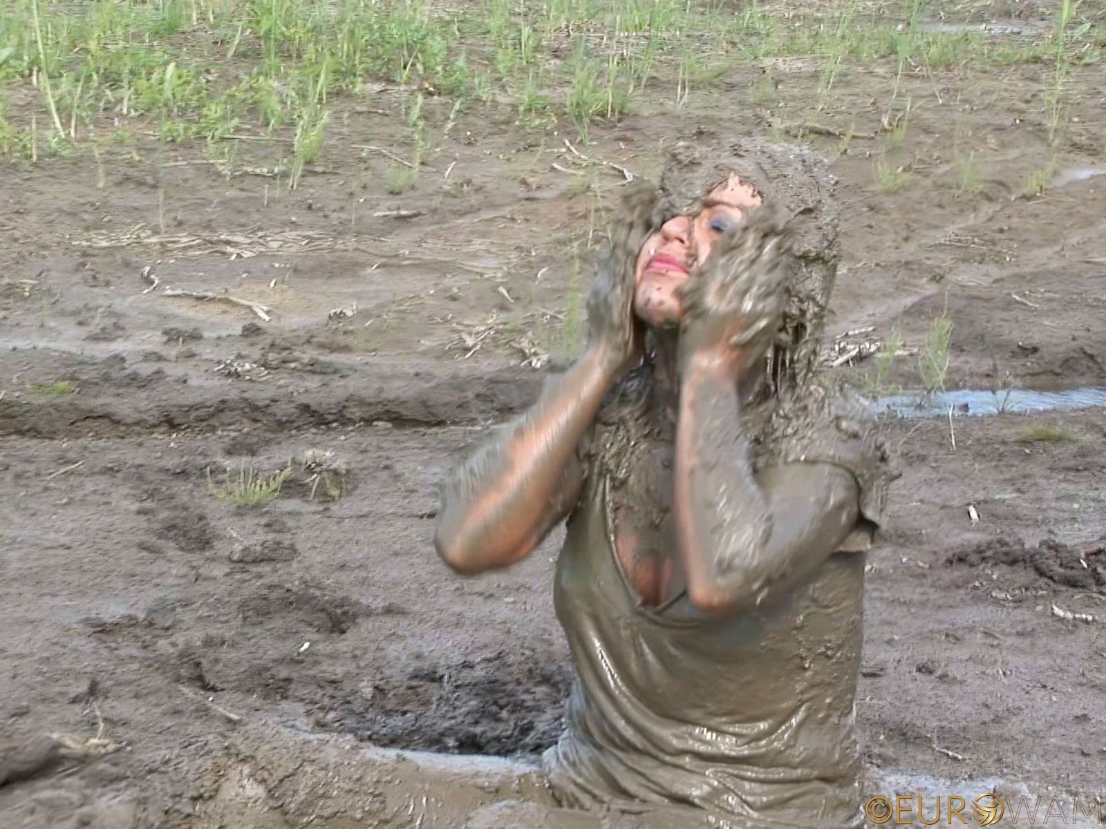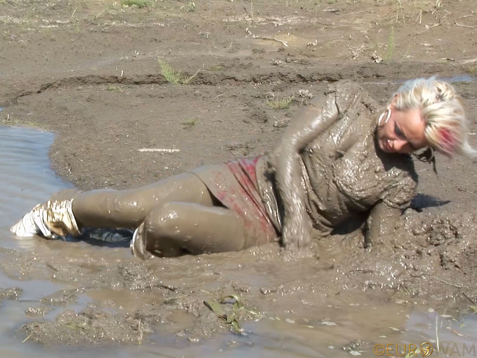remastered, mud, messy, boots, pantyhose, skirt, t-shirt