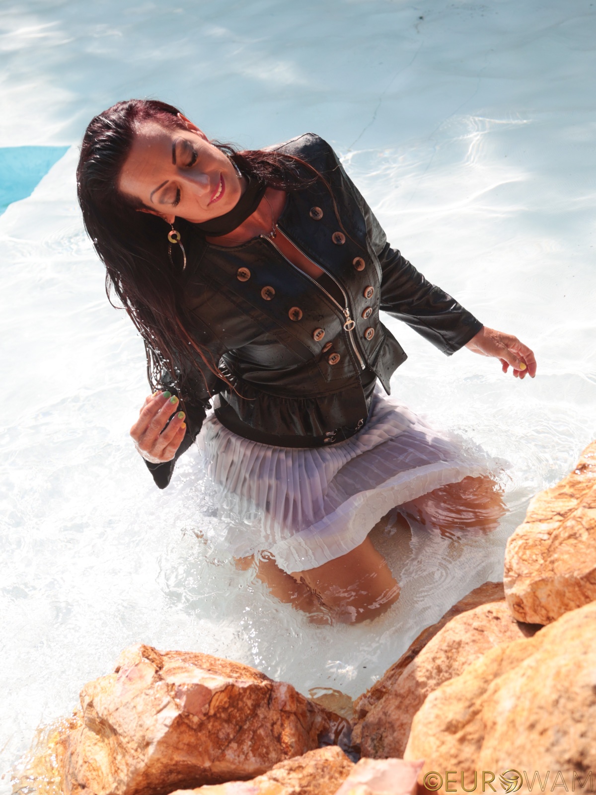 pool, heels, pantyhose, top, leather, jacket