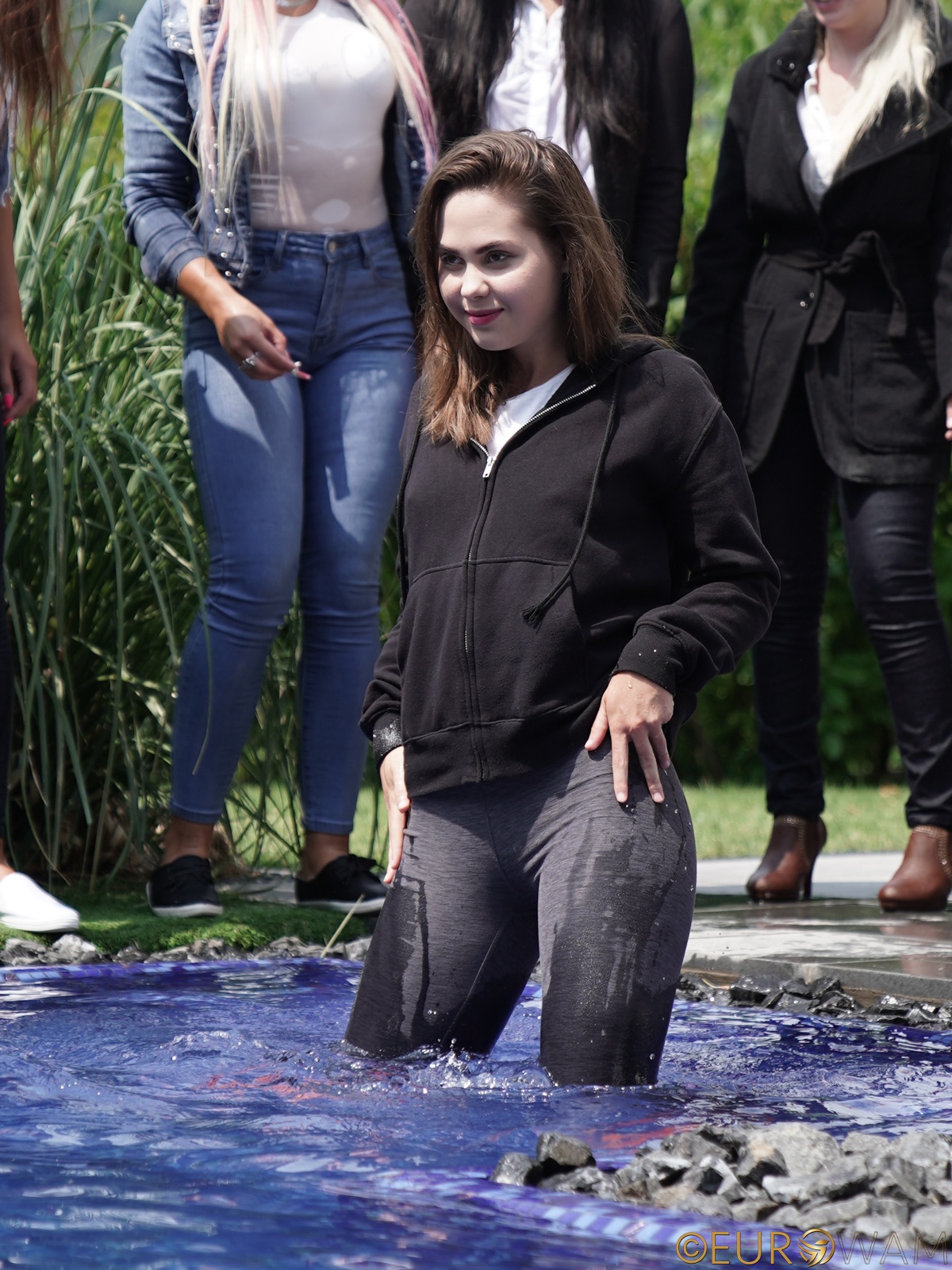 pool, sneakers, sports clothes, leggings, seethru, braless, louse, hoodie