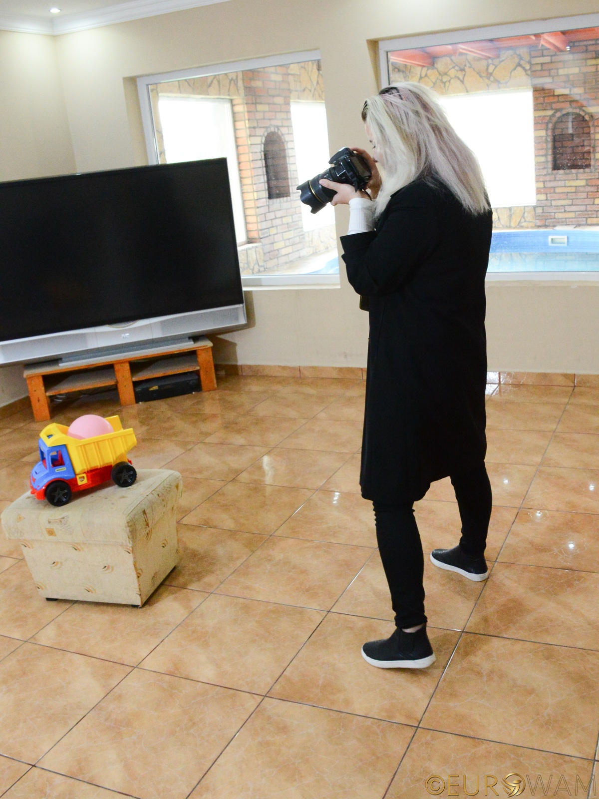She placed the little yellow truck on the stool, stepped back, lifted the camera, and started working like a real professional photographer.
